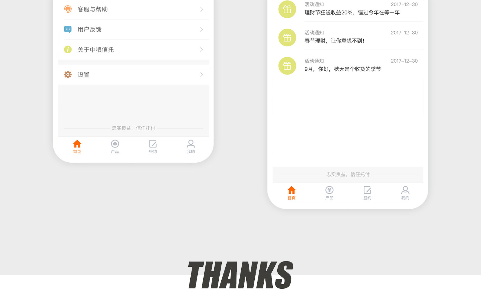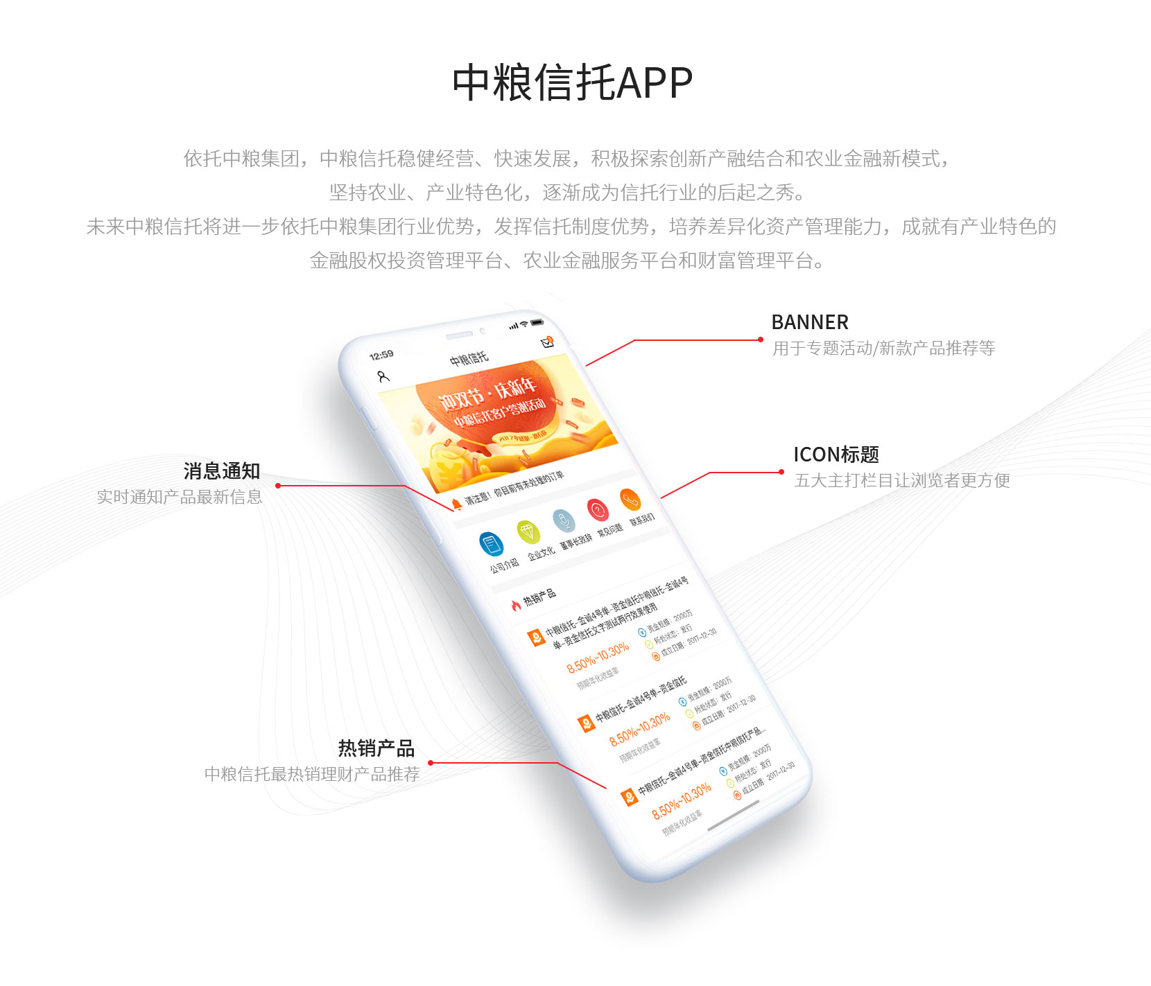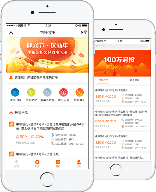 神州互動為(wèi)中糧信托打造官方APP,以國(guó)際流行(xíng)的(de)扁δ§平化(huà)和(hé)色塊方格的(de)長(chá$₩≤×ng)布局為(wèi)核心,通(tōng)過錯(cuò)落排版的(de)圖片色塊相(xiàng)€±<對(duì)均勻地(dì)吸引用(yòng)戶的(de)注意★☆ε<力,并以扁平化(huà)的(de)處理(lǐ)方式讓每個(gè)元素更加易用(yònδ γg)、易辨識,突出核心內(nèi)容